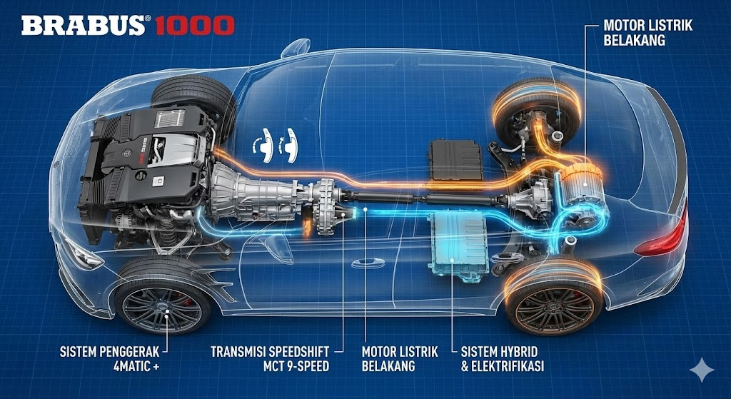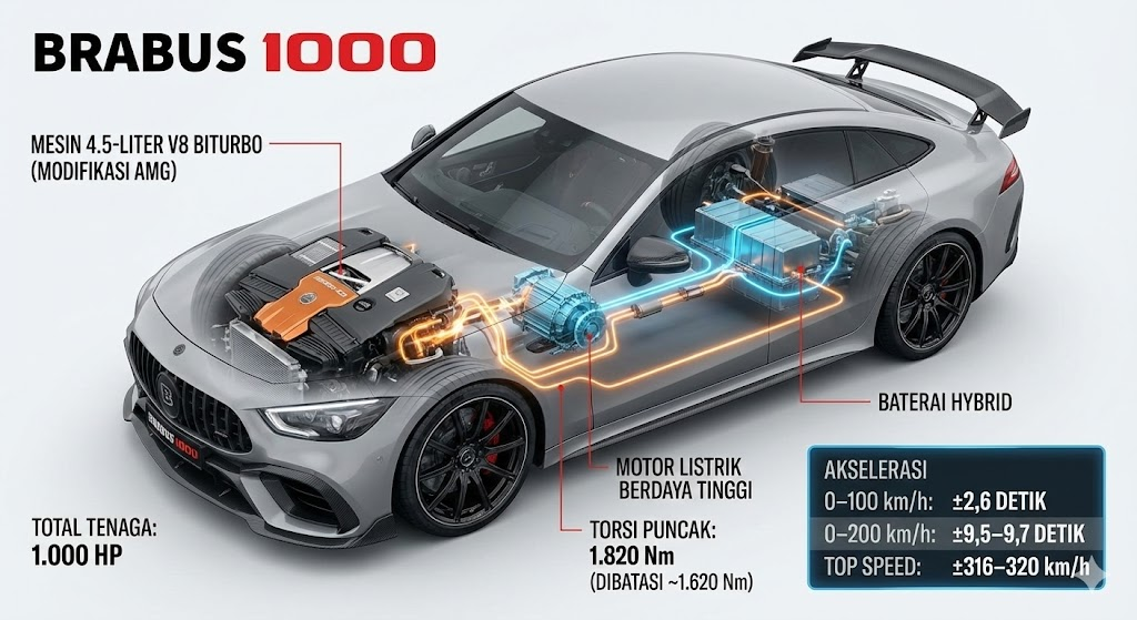 Brabus 1000 adalah salah satu supercar paling ekstrem dari tuner asal Jerman, Brabus. Berbasis Mercedes‑AMG GT 63 S E Performance, mobil ini menawarkan kombinasi mesin V8 biturbo dan tenaga listrik, menciptakan performa yang mengungguli banyak supercar lain di dunia. Meskipun belum umum di jalanan Indonesia, Brabus 1000 sering jadi bahan perbincangan para pecinta otomotif karena performanya yang sangat buas dan eksklusif.