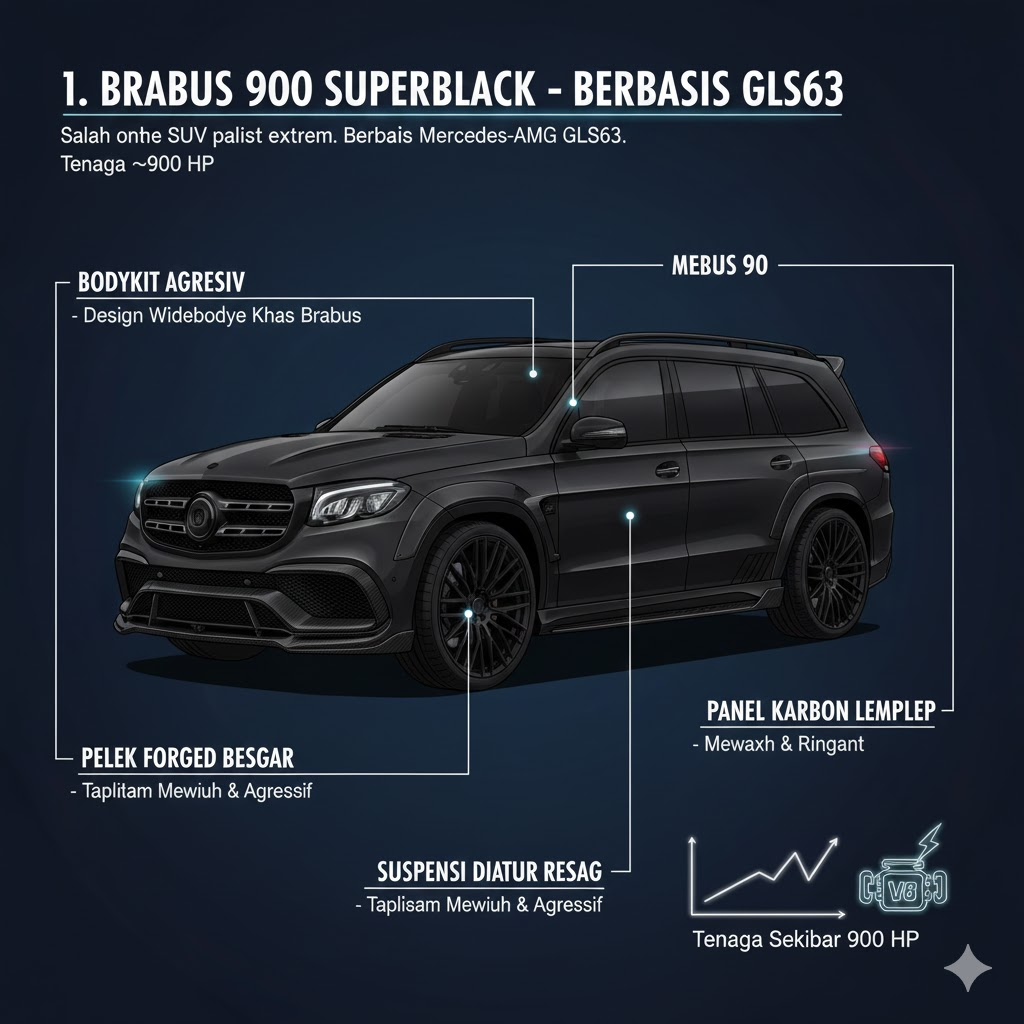 Brabus 900 Superblack adalah salah satu SUV paling ekstrem yang ditawarkan Brabus. Berbasis Mercedes‑AMG GLS63, mobil ini menyajikan tenaga sekitar 900 HP, jauh di atas standar GLS63 pabrikan.