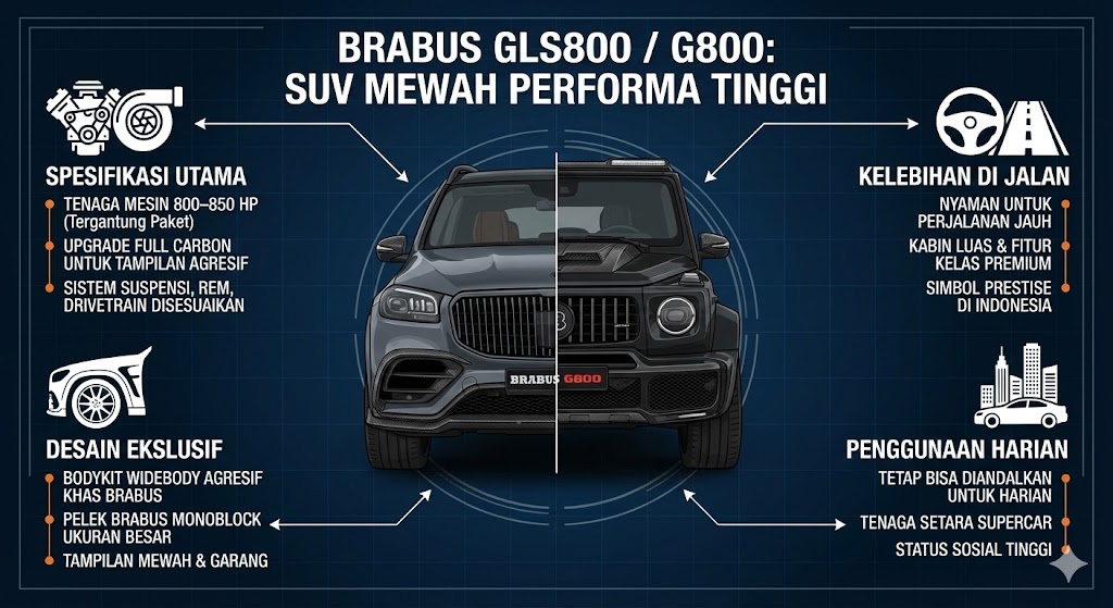 Brabus dikenal sebagai tuner yang mengubah Mercedes‑Benz menjadi kendaraan ekstrem, tidak hanya pada G‑Class tapi juga SUV besar seperti GLS63 dan G800. Di Indonesia, model-model ini semakin populer karena gabungan performa tinggi, kenyamanan, dan tampilan agresif yang mencolok.